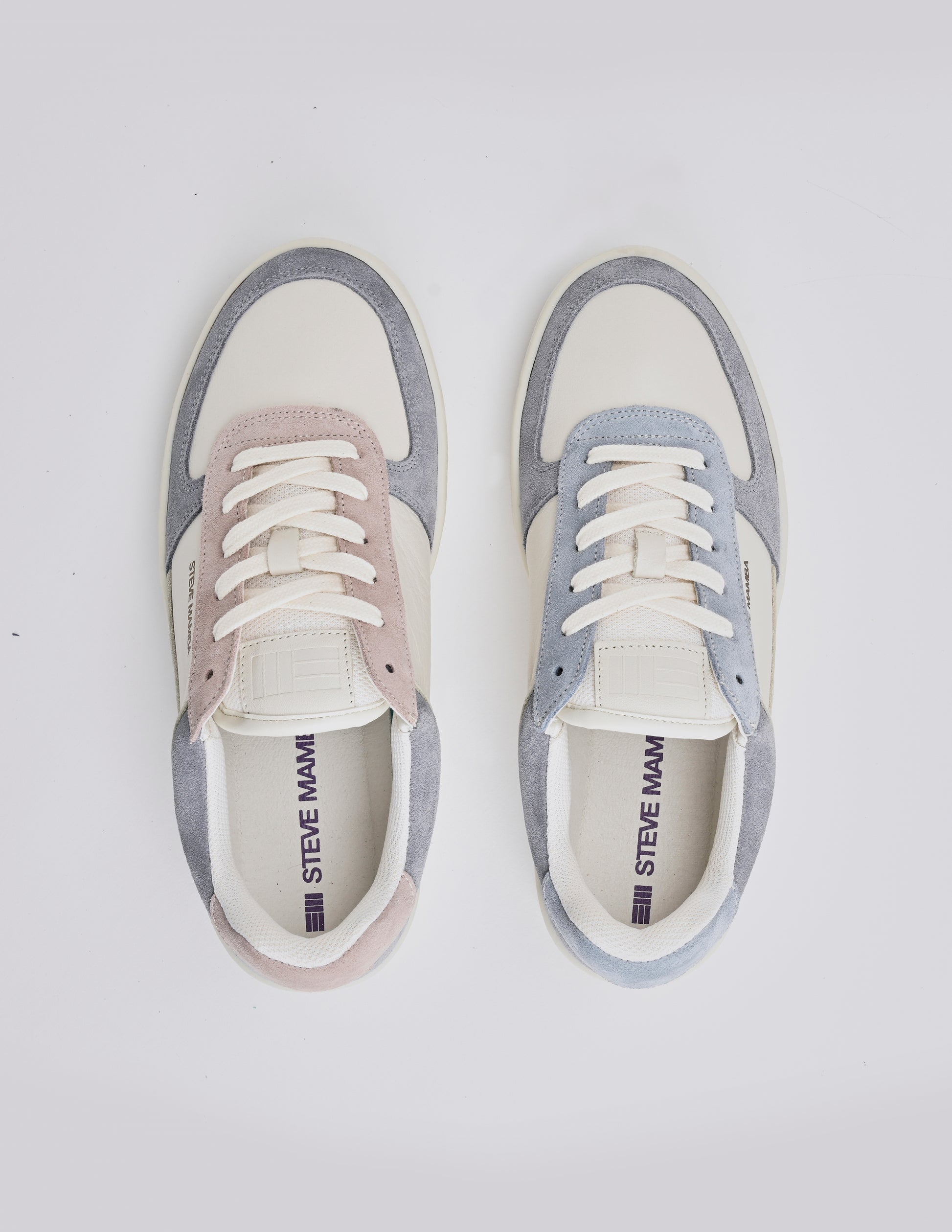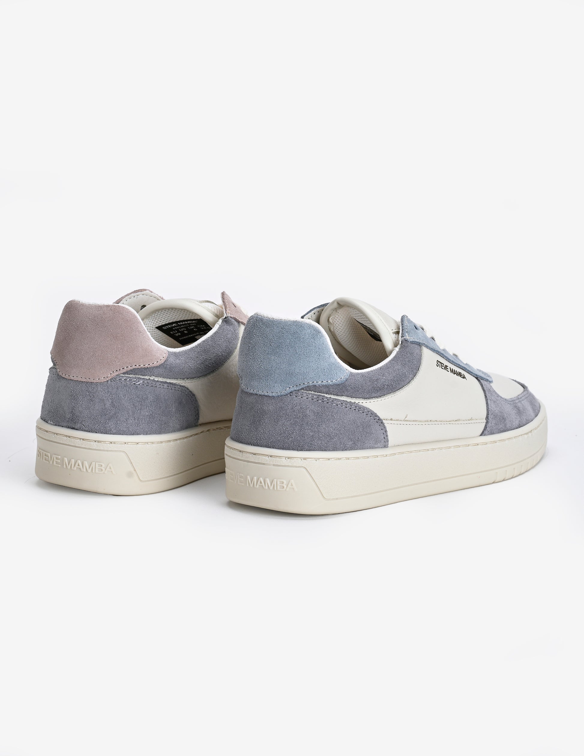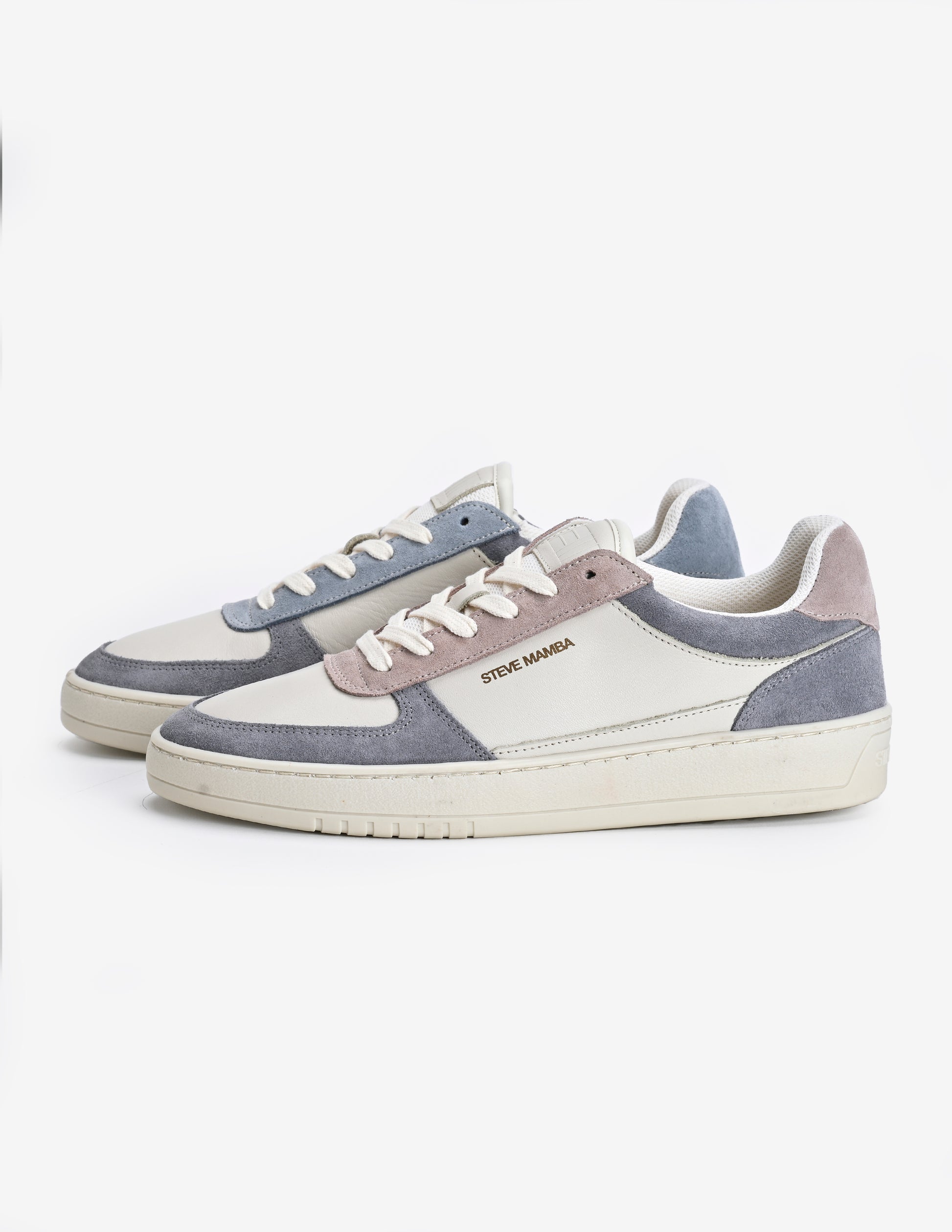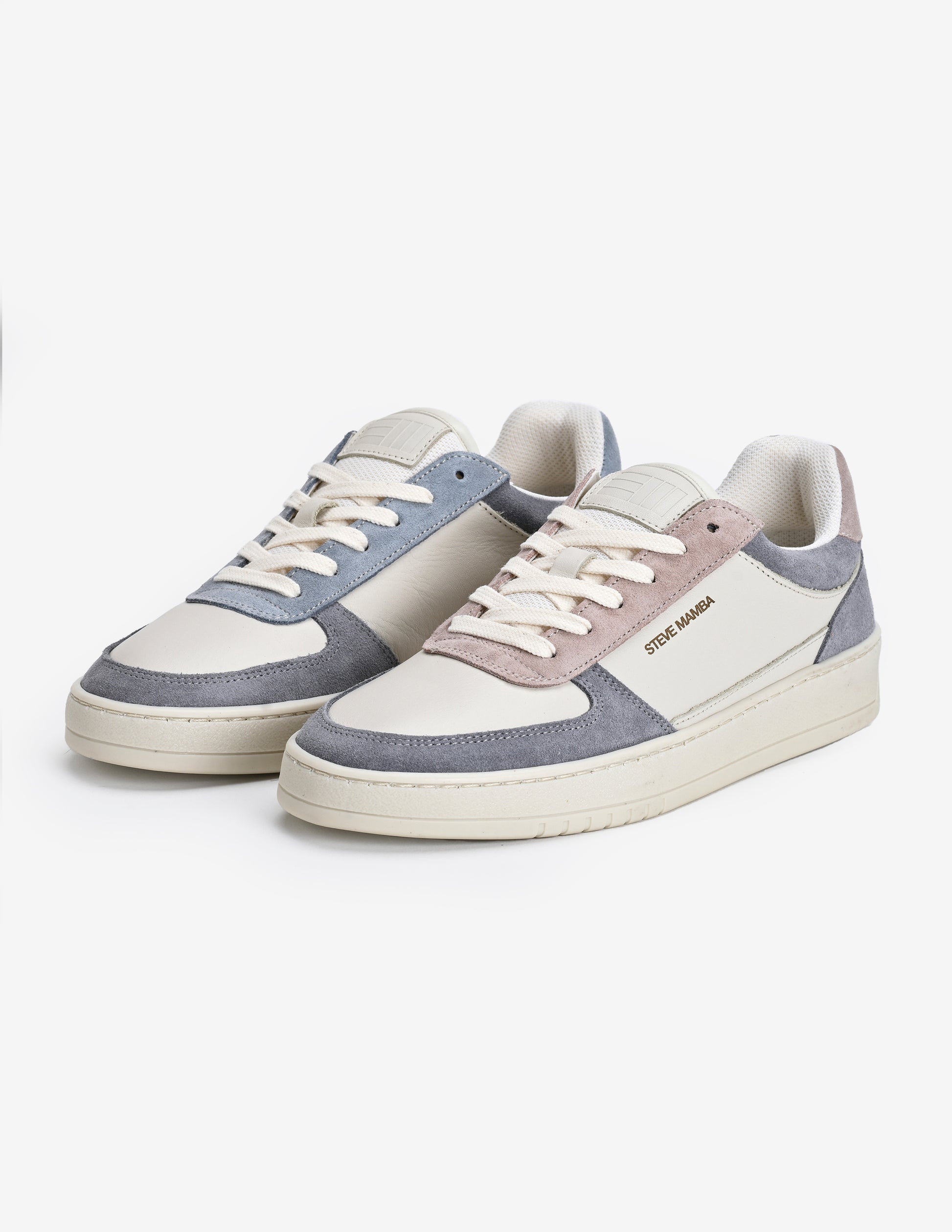 Pie izquierdo: Base de cuero blanco roto y serraje azúl en puntera y talón, con acabados de ante en tono rosa palo.