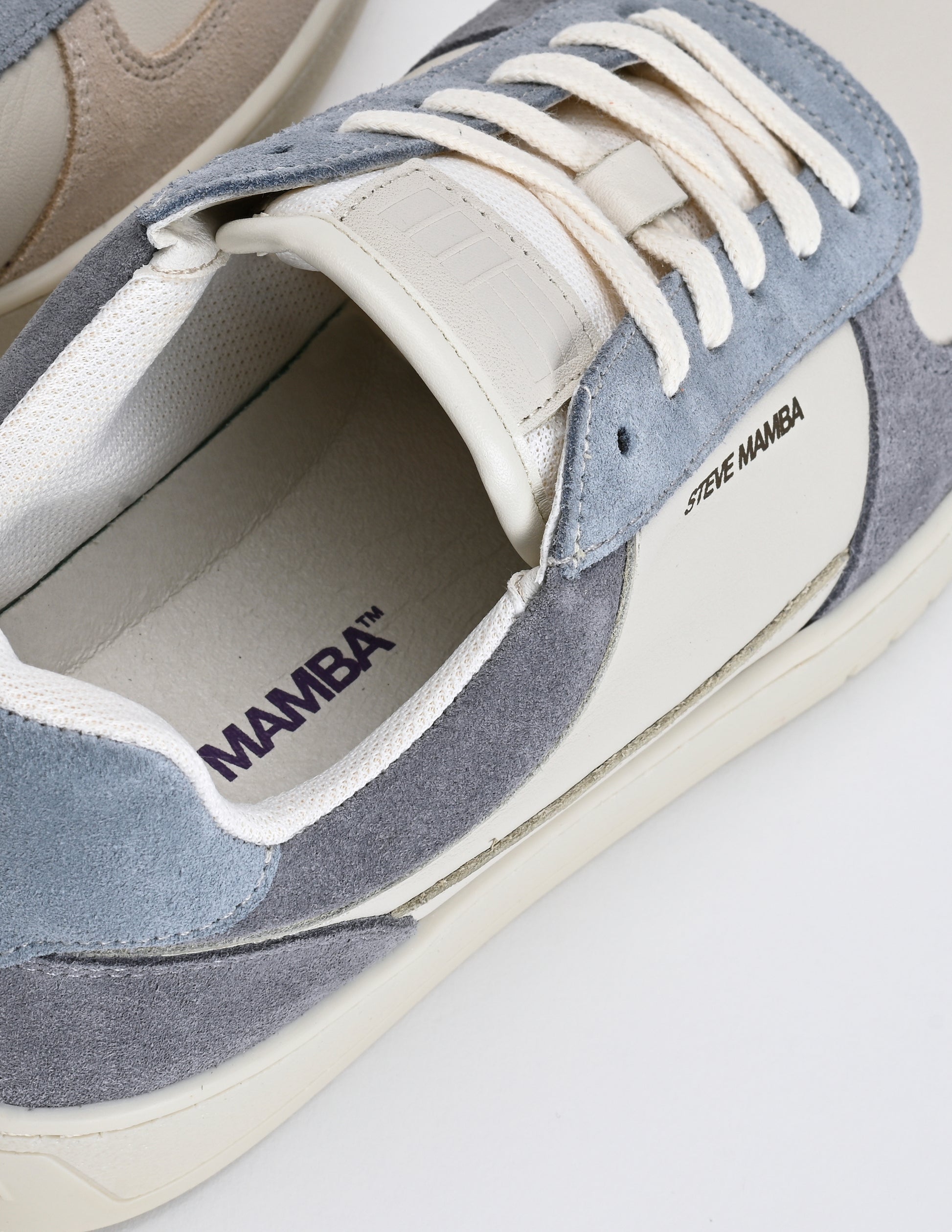 Pie derecho: Base de cuero blanco roto y serraje beige en puntera y talón, con acabados de ante en tono azul claro.